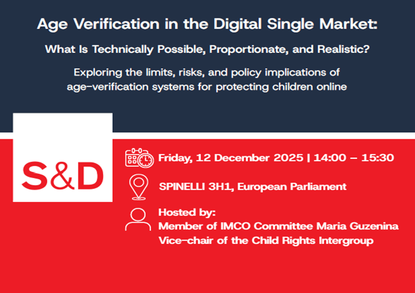 MEP EVENTAge Verification in the Digital Single MarketWhat Is Technically Possible, Proportionate, and Realistic?📅 Date:Friday, 12 December 2025🕐 Time:14:00 – 15:30📍 Location:ASP 3H1, European ParliamentHosted by Maria GUZENINA Finland MEP Vice-chair of the Child Rights IntergroupMember of Internal Market and Consumer Protection Committee (IMCO) S&D Group Social Democratic Party of Finland About the EventExploring the limits, risks, and policy implications of age-verification systems for protecting children online in the context of the Digital Single Market. This event examines what is technically possible, proportionate, and realistic when implementing age verification measures across EU platforms and services.Join us for an in-depth discussion on the technical realities, privacy implications, and regulatory challenges of age verification technologies designed to ensure child safety in digital environments while respecting fundamental rights and data protection principles.Important – This event is by invitation, and only registered participants will be admitted. Due to capacity constraints, all attendees must register, including those already holding a European Parliament access badge.