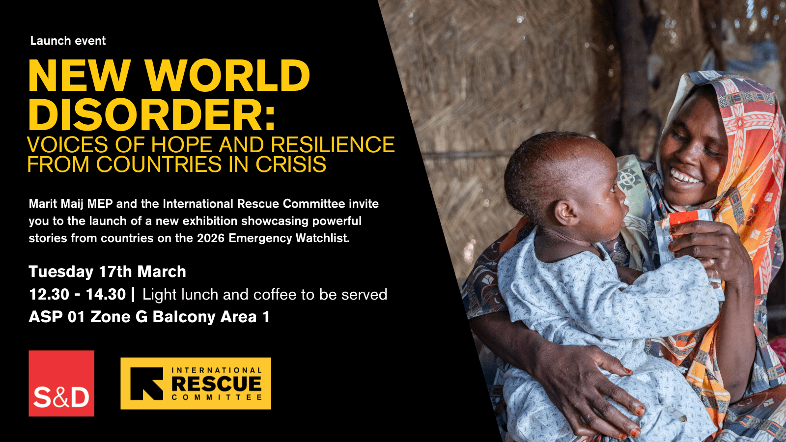 MEP EVENT New World Disorder: Voices of hope and resilience from countries in crisisPhoto Exhibition📅 Date:Tuesday, 17 March 2026🕐 Time:12:30 – 14:30 CET📍 Location:European Parliament, ASP 01 zone G Balcony AreaAbout the EventThe exhibition offers a glimpse into the lives of IRC staff and the people they serve in Watchlist countries, highlighting what is at stake in ongoing policy debates about the future of humanitarian aid. Speakers will include Marit Maij MEP, representatives from Watchlist countries, and civil society.The IRC's Emergency Watchlist highlights the 20 countries most at risk of new or worsening humanitarian crises in the year ahead. As you move through the exhibition you will see why Europe's continued engagement in crisis contexts matters more than ever. At a time when humanitarian needs are soaring and global support is shrinking, EU leadership can help protect people from the worst impacts of this new era.This event takes place at a timely moment, as the European Commission prepares its forthcoming Communication on Humanitarian Aid, and as discussions continue to unfold in the European Parliament and among Member States on the future of the Global Europe instrument under the 2028–2034 MFF.Hosted by+Marit MAIJ MEP Netherlands Member of the European Parliament GroenLinks-PvdA Marit MAIJCommitteesCONT EMPL DEVE HOUSDelegationsDCAR DACP DAFR D-CN DSAS×Important This event is by invitation, and only registered participants will be admitted. Due to capacity constraints, all attendees must register, including those already holding a European Parliament access badge.