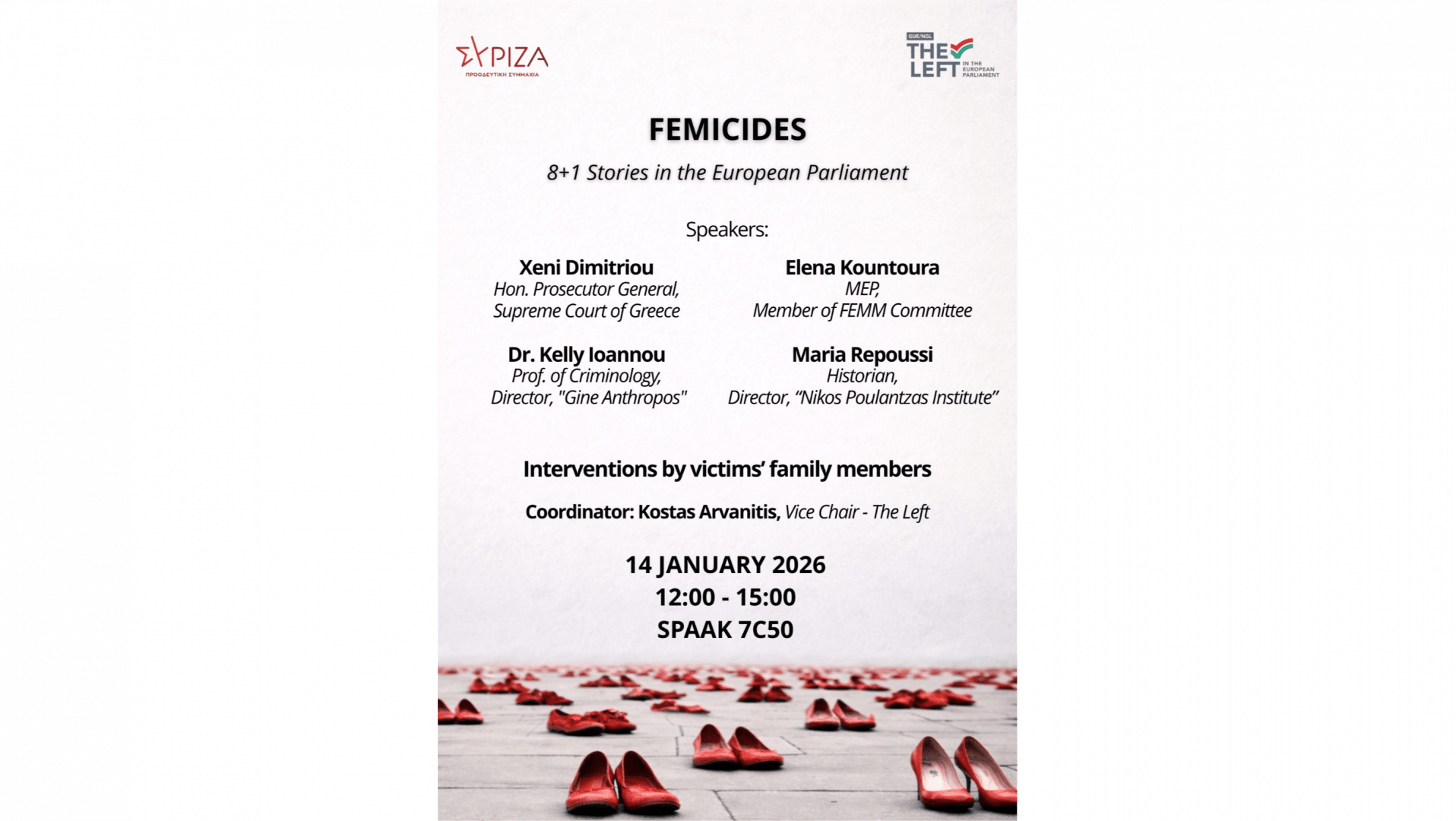 MEP EVENT Femicides: 8 + 1 stories at the European Parliament📅 Date:Wednesday 14 January 2026🕐 Time:12:00 – 15:00📍 Location:Room PHS7C50Hosted byKonstantinos ARVANITIS Greece MEP Vice-Chair of GUE/NGL GroupGUE/NGLCoalition of the Radical Left (Greece) Through the testimonies of relatives of victims, as well as with the participation of institutional representatives and scientific experts, the discussion on femicide - the ultimate and most extreme expression of violence against women - shifts from abstract condemnation to collective responsibility, urgently calling for effective policies for prevention, protection, and accountability, both at the national and European level.Testimonies from FamiliesRelatives of femicide victims will share their experiences, bringing voice to those who can no longer speak:Alexandra Makou, mother of Garifalia PsarrakouEleni Kremastioti, mother of Erato ManolakelliAngeliki Berdou, mother of Polyxeni BerdouRosa Fotiadou, mother of Sofia SavvidouKaterina Koti, mother of Dora ZachariaJessica (Stefania) Danai, daughter of EnkeilaYannis Topaloudis & Koula Armoutidou, parents of Eleni TopaloudiDespoina Kallea, mother of Kyriaki GrivaEmmanuel Athanasiou, cousin of Efi TsichlakiSpeakersXeni DIMITRIOUHonorary Prosecutor of the Supreme CourtElena KOUNTOURA Greece MEP Vice-Chair of TRAN CommitteeGUE/NGLCoalition of the Radical Left (Greece) Dr. Kelly IOANNOUProfessor of CriminologyPresident of the NGO "Gine Anthropos" Maria REPOUSIHistorianDirector of the Nikos Poulantzas Institute Important – This event is by invitation, and only registered participants will be admitted. Due to capacity constraints, all attendees must register, including those already holding a European Parliament access badge.