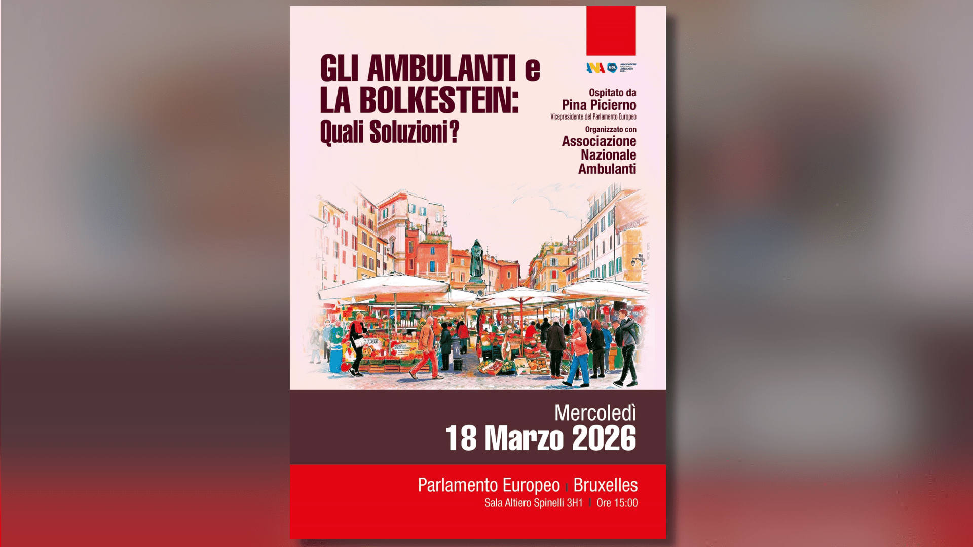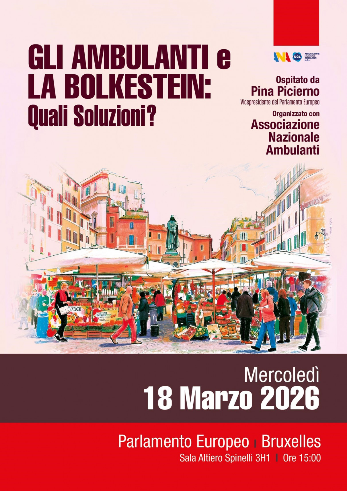 MEP EVENT Street Traders and the Bolkestein Directive: What Solutions?📅 Date:Wednesday, 18 March 2026🕐 Time:15:00 – 17:00 CET📍 Location:Room ASP 3H1, European Parliament (Brussels)About the EventTwenty years after the entry into force of the Bolkestein Directive, this meeting will provide an important opportunity for discussion and in-depth reflection on the legislation applied to the street trading sector. The event will offer a moment of dialogue aimed at the full implementation of the Directive, while also promoting constructive cooperation between the stakeholders involved.Hosted by+Pina PICIERNOMEP Italy Vice-President of the European ParliamentS&D | PDPartito Democratico Pina PICIERNOCommitteesPETI EUDS LIBEDelegationsD-UA DEPA D-IL×Important This event is by invitation, and only registered participants will be admitted. Due to capacity constraints, all attendees must register, including those already holding a European Parliament access badge.