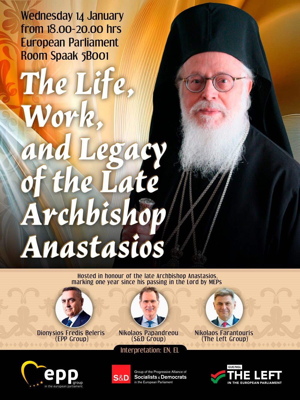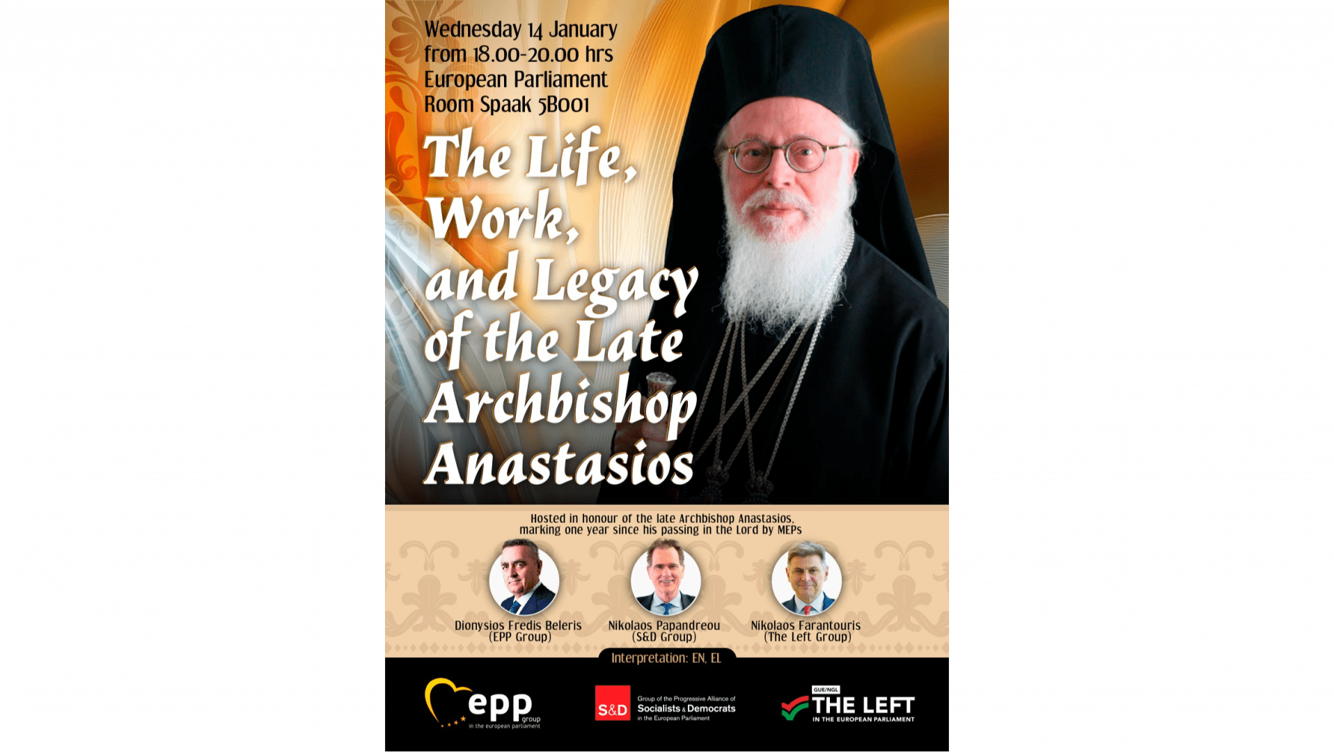 MEP EVENT The Life, Work, and Legacy of the Late Archbishop AnastasiosIn Honour of Archbishop of Albania Anastasios📅 Date:Wednesday 14 January 2026🕐 Time:18:00 – 20:00📍 Location:Room PHS 5B001, European Parliament, BrusselsHosted byDionysios Fredis BELERIS Greece MEP Vice-Chair of PETI CommitteeEPP GroupNea Demokratia Nikos PAPANDREOU Greece MEP Member of ECON & SANT CommitteesS&D GroupPASOK-KINAL Nikolas FARANTOURIS Greece MEP Member of BUDG & AFCO CommitteesThe Left GroupCoalition of the Radical Left About the EventThis event is organised in honour of the late Archbishop of Albania Anastasios, marking one year since his passing in the Lord.Interpretation AvailableEN • ELSpeakersArchbishop IoannisArchbishop of AlbaniaVangelis DulesMember of Parliament of AlbaniaPresident of the Human Rights Union PartyGenc PolloHistorianFormer Minister of Education of AlbaniaDimitra KoukouraProfessor (Retired)Department of Theology, Aristotle University of ThessalonikiXanthi MorfiExecutive StaffWorld Council of ChurchesImportant – This event is by invitation, and only registered participants will be admitted. Due to capacity constraints, all attendees must register, including those already holding a European Parliament access badge.