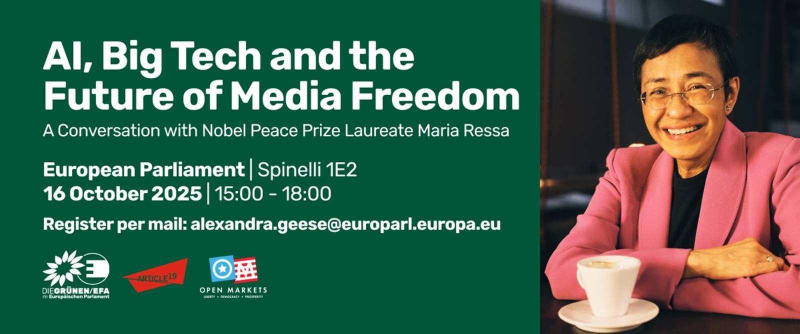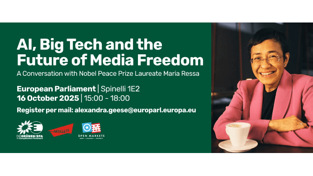 MEP Event AI, Big Tech and the Future of Media Freedom – A Conversation with Nobel Peace Prize Laureate Maria Ressa📅 Date:Thursday, 16 October 2025🕐 Time:15:00 – 18:00📍 Location:Room Spinelli 1E2, European Parliament, BrusselsOrganised byAlexandra GEESEMember of the European ParliamentGreens/EFA GroupBündnis 90/Die Grünen (DE) Co-hosted with the Open Markets Institute and Article 19, this event will feature Nobel Peace Prize Laureate Maria Ressa and a distinguished panel of experts and policymakers. Together, we will explore the profound influence of Big Tech on democracy, human rights, and the public sphere, and discuss actionable solutions to safeguard media freedom and empower citizens in the digital age.Special Guest🏆Nobel Peace Prize 2021Maria RESSANobel Peace Prize Laureate 2021Co-founder and CEO, RapplerProgramme15:00Introductory remarksAlexandra Geese – MEP, Greens/EFANicolae Ștefănuță – Vice President EU Parliament, MEP, Greens/EFACourtney Radsch – Director, Center for Journalism and Liberty, Open Markets Institute15:15Keynote and Fireside chat with Q&AEnabling authoritarianism through corporate-government collusion?Maria Ressa – Nobel Peace Prize 2021, Co-founder and CEO, RapplerModerated by Courtney Radsch – Open Markets Institute16:15Panel: AI, Big Tech and the Future of Media FreedomAlexandra Geese – MEP, Greens/EFAMira Milosevic – Global Forum for Media DevelopmentQuinn McKew – Executive Director, ARTICLE 19Dimi Zagorski – Europe Policy Director, WikimediaModerated by Courtney Radsch – Open Markets InstituteTopics: Digital regulation, platform accountability, media pluralism, algorithmic transparency17:30Closing remarksBarry Lynn – Executive Director, Open Markets InstituteSpeakersNicolae ȘTEFĂNUȚĂVice President of the European ParliamentGreens/EFA GroupIndependent (RO) Courtney RADSCHDirector, Center for Journalism and LibertyOpen Markets InstituteMira MILOSEVICGlobal Forum for Media DevelopmentQuinn McKEWExecutive DirectorARTICLE 19Dimi ZAGORSKIEurope Policy DirectorWikimediaBarry LYNNExecutive DirectorOpen Markets Institute