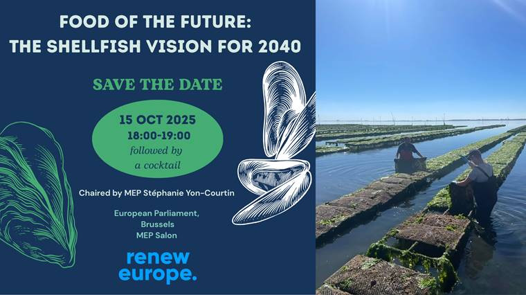 MEP Stéphanie Yon-Courtin (Renew Europe) and the European Molluscs Producers' Association (EMPA) are honoured to invite you to an important conference on the sustainability of food from the oceans. The event will take place in Brussels on the evening of 15 October 2025 in the MEPs Salon, and will be followed by a shellfish tasting & cocktail reception.