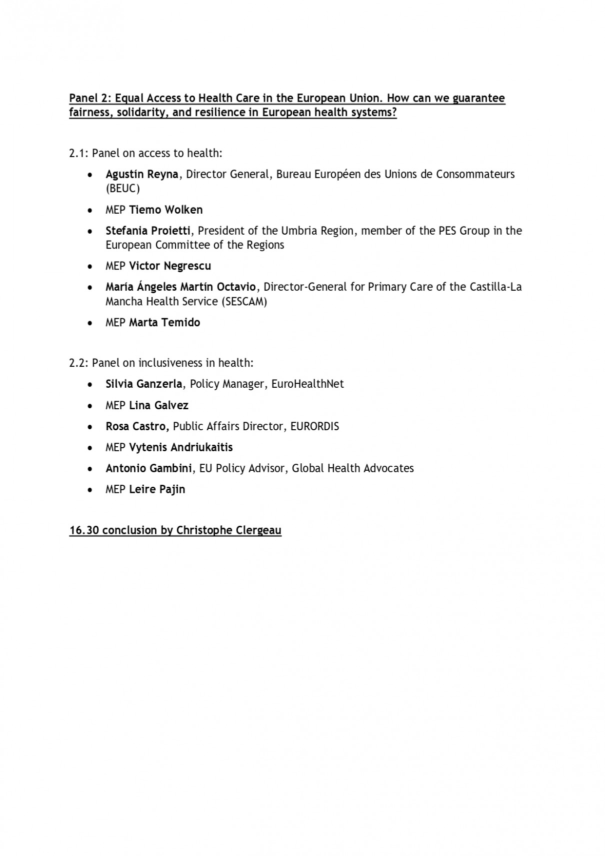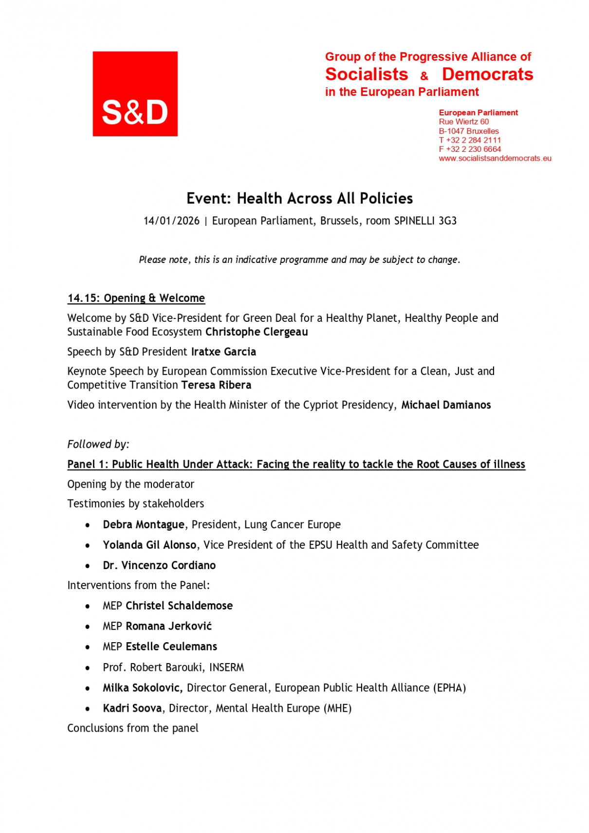 S&D Group EventHealth Across all PoliciesDefending health as a fundamental right for everyone in the EU📅 Date:Tuesday, 14 January 2026🕐 Time:14:15 – 16:30📍 Location:European Parliament, BrusselsRoom SPINELLI 3G3🎤 Interpretation:EN | FR | DE | ESAbout the EventAs Socialists and Democrats in the European Parliament, we believe that health is a fundamental right, not a privilege. Join us at the European Parliament in Brussels on 14 January 2026 to learn how we want to defend that right for everyone in the EU.Building on the approach set out in the S&D position paper Health as a Priority Across All Policies, this event will discuss actions in two key areas: how EU policy making can best tackle the diverse root causes of illness; and, the way forward for guaranteeing equal access to healthcare in the EU.Join S&D President Iratxe García Pérez, S&D vice-president Christophe Clergeau, S&D MEPs, NGOs and other stakeholders in room SPINELLI 3G3 at 14.15 for a discussion on public health as one of the foundations of social justice, democratic stability, and citizens' well-being.⚠️ Important – This event is by invitation, and only registered participants will be admitted. Due to capacity constraints, all attendees must register, including those already holding a European Parliament access badge.Programme14:15Opening & WelcomeWelcome by S&D Vice-President for Green Deal for a Healthy Planet, Healthy People and Sustainable Food Ecosystem Christophe Clergeau14:15⭐ Speech by S&D PresidentIratxe García Pérez, S&D Group President14:15⭐ Keynote SpeechTeresa Ribera, European Commission Executive Vice-President for a Clean, Just and Competitive Transition14:15⭐ Video InterventionMichael Damianos, Health Minister of the Cypriot Presidency14:30Panel 1: Public Health Under Attack: Facing the reality to tackle the Root Causes of illnessOpening by the moderatorTestimonies by stakeholdersDebra Montague, President, Lung Cancer EuropeInterventions from the Panel:MEP Romana JerkovićMEP Estelle CeulemansInterventions from NGOsKadri Soova, Director, Mental Health Europe (MHE)Milka Sokolovic, Director General, European Public Health Alliance (EPHA)Prof. Robert Barouki, INSERMConclusions from the panel15:30Panel 2: Equal Access to Health Care in the European Union. How can we guarantee fairness, solidarity, and resilience in European health systems?2.1: Panel on access to health:Agustín Reyna, Director General, Bureau Européen des Unions de Consommateurs (BEUC)MEP Tiemo WolkenStefania Proietti, President of the Umbria RegionMEP Victor NegrescuMEP Marta Temido2.2: Panel on inclusiveness in health:MEP Lina Gálvez MuñozRosa Castro, Public Affairs Director, EURORDISMEP Vytenis AndriukaitisMEP Leire Pajín16:30ConclusionChristophe ClergeauHosted byIratxe GARCÍA PÉREZ Spain MEP President of the S&D GroupPartido Socialista Obrero EspañolS&D Group Special GuestsEuropean CommissionerTeresa RIBERA Spain Commission Executive Vice-PresidentClean, Just and Competitive TransitionMinisterMichael DAMIANOS Cyprus Health MinisterCypriot PresidencySpeakersRomana JERKOVIĆ Croatia MEP Vice-Chair SANT | Member ENVI | Substitute EMPLSocijaldemokratska partija HrvatskeS&D Group Christophe CLERGEAU France MEP S&D Group Vice-Chair | Member ENVI, SANT | Substitute DEVE, ITREParti socialisteS&D Group Estelle CEULEMANS Belgium MEP Member EMPL | Substitute ENVI, SANTParti SocialisteS&D Group Tiemo WÖLKEN Germany MEP Member ENVI, SANT | Substitute JURISozialdemokratische Partei DeutschlandsS&D Group Victor NEGRESCU Romania MEP Member BUDG, SANT, JURIPartidul Social DemocratS&D Group Marta TEMIDO Portugal MEP Vice-Chair DROI | Member AFET, ENVI | Substitute SANT, AGRIPartido SocialistaS&D Group Lina GÁLVEZ Spain MEP Chair FEMM | Member ITRE | Substitute INTAPartido Socialista Obrero EspañolS&D Group Vytenis ANDRIUKAITIS Lithuania MEP Member ENVI, SANT | Substitute AFCOLietuvos socialdemokratų partijaS&D Group Leire PAJÍN Spain MEP Vice-Chair DLAT | Member DEVE | Substitute ENVI, SANT, JURIPartido Socialista Obrero EspañolS&D Group Debra MONTAGUEPresidentLung Cancer EuropeKadri SOOVADirectorMental Health Europe (MHE)Milka SOKOLOVICDirector GeneralEuropean Public Health Alliance (EPHA)Prof. Robert BAROUKIResearcherINSERMAgustín REYNADirector GeneralBureau Européen des Unions de Consommateurs (BEUC)Stefania PROIETTI ly President of the Umbria RegionRegional GovernmentRosa CASTROPublic Affairs DirectorEURORDISImportant – This event is by invitation, and only registered participants will be admitted. Due to capacity constraints, all attendees must register, including those already holding a European Parliament access badge.