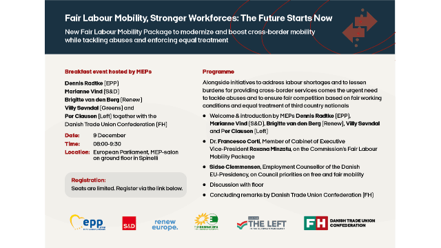 MEP Event Fair Labour Mobility, Stronger Workforces: The Future Starts NowNew Fair Labour Mobility Package to modernize and boost cross-border mobility while tackling abuses and enforcing equal treatment📅 Date:Tuesday, 9 December 2025🕐 Time:08:00 - 09:30 CET📍 Location:European Parliament, BrusselsHosted byDennis RADTKE Germany MEP Member of European ParliamentEPP GroupCDU Marianne VIND Denmark MEP Member of European ParliamentS&D GroupSocialdemokratiet Brigitte VAN DEN BERG Netherlands MEP Member of European ParliamentRenew EuropeVVD Villy SØVNDAL Denmark MEP Member of European ParliamentGreens/EFASocialistisk Folkeparti Per CLAUSEN Denmark MEP Member of European ParliamentThe LeftEnhedslisten About the EventAlongside initiatives to address labour shortages and to lessen burdens for providing cross-border services comes the urgent need to tackle abuses and to ensure fair competition based on fair working conditions and equal treatment of third country nationals.Programme08:00Welcome & IntroductionMEPs Dennis Radtke (EPP), Marianne Vind (S&D), Brigitte van den Berg (Renew), Villy Søvndal (Greens/EFA) and Per Clausen (The Left)08:15Elements of the Fair Labour Mobility PackageDr. Francesco Corti, Member of Cabinet of Executive Vice-President Roxana Mînzatu08:45Council PrioritiesSidse Clemmensen, Employment Counsellor of the Danish EU-Presidency09:00Discussion with FloorOpen discussion and Q&A session09:20Concluding RemarksDanish Trade Union Confederation (FH)SpeakersDr. Francesco CORTIMember of CabinetExecutive Vice-President Roxana Mînzatu, European Commission Sidse CLEMMENSENEmployment CounsellorDanish EU-Presidency Organised in cooperation withFH – Danish Trade Union ConfederationFagbevægelsens HovedorganisationImportant – This event is by invitation, and only registered participants will be admitted. Due to capacity constraints, all attendees must register, including those already holding a European Parliament access badge.
