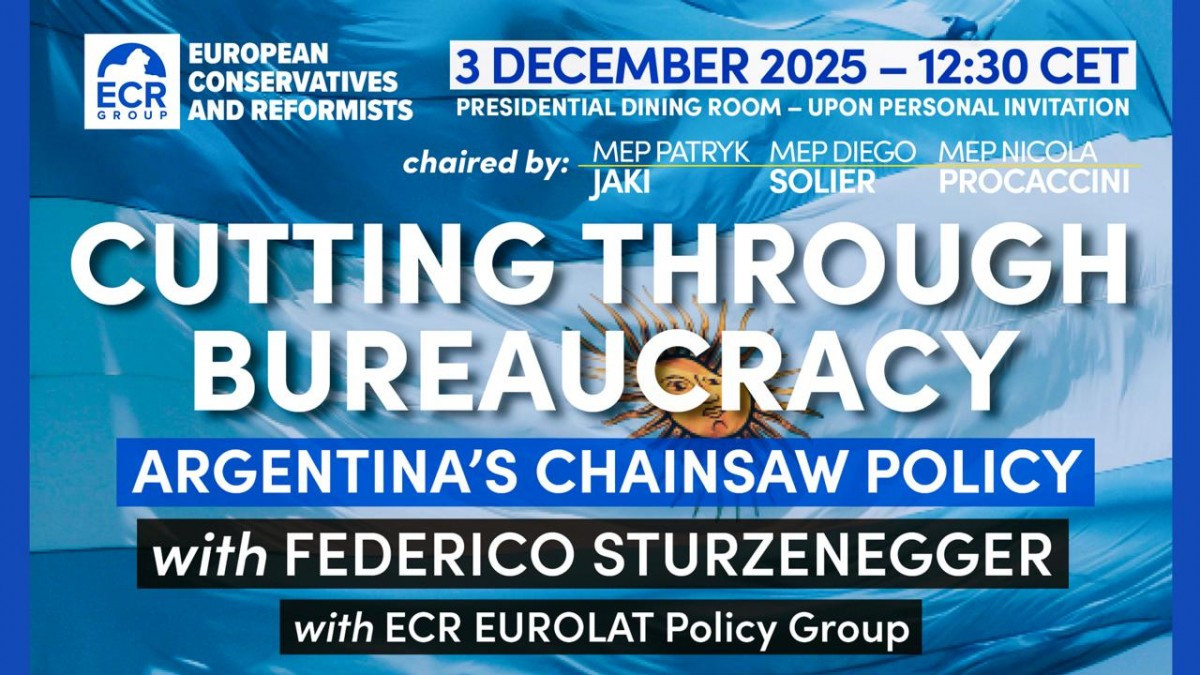 ECR EVENTCutting Through BureaucracyArgentina's Chainsaw Policy📅 Date:Wednesday, 3 December 2025🕐 Time:Lunch Roundtable📍 Location:European Parliament, BrusselsHigh-Level EventAbout the EventOn Wednesday 3 December, the ECR EUROLAT Policy Group will welcome Federico Sturzenegger, Minister of Deregulation and State Transformation of Argentina to the European Parliament.Federico Sturzenegger is a prominent Argentine economist and academic. His current ministerial portfolio in Argentina – Deregulation and State Transformation – has been created by President Milei to drive through market-oriented reforms.Mr Sturzenegger will deliver a keynote speech at the high-level lunch roundtable, speaking about Argentina's reforms, his experience in deregulation, economic freedom, state intervention and bureaucracy.Keynote Speaker⭐ Minister of ArgentinaFederico STURZENEGGERMinister of Deregulation and State TransformationArgentina Read more about Federico Sturzenegger's backgroundHosted byPatryk JAKI Poland Member of the European Parliament Co-Chairman of the ECR GroupEuropean Conservatives and Reformists (ECR)Member of European Parliament Nicola PROCACCINI Italy Member of the European Parliament Co-Chairman of the ECR GroupEuropean Conservatives and Reformists (ECR)Fratelli d'Italia Diego SOLIER Spain Member of the European Parliament Member of European ParliamentEuropean Conservatives and Reformists (ECR)Independiente Important – This event is by invitation, and only registered participants will be admitted. Due to capacity constraints, all attendees must register, including those already holding a European Parliament access badge.