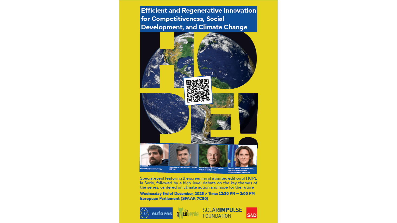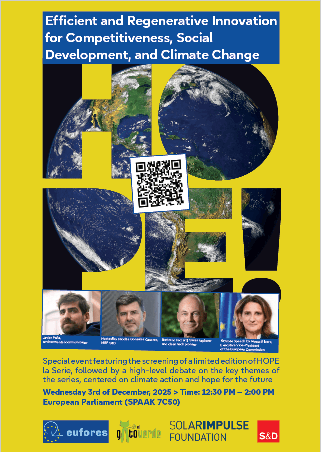MEP EVENT Debate and screening of HOPE! la Serie on the energy transition📅 Date:Wednesday, 3 December 2025🕐 Time:12:30 - 14:00 CET📍 Location:European Parliament, BrusselsRoom PHS 7C50Hosted byNicolás GONZÁLEZ CASARES Spain Member of the European Parliament Member of the European ParliamentPresident, EUFORESCommittee on Industry, Research and Energy (ITRE)Committee on the Environment, Public Health and Food Safety (ENVI)S&D GroupPartido Socialista Obrero Español (ES) Keynote speakerTeresa RIBERAExecutive Vice-PresidentEuropean CommissionClean, Just and Competitive TransitionAbout the EventThis high-level event features a keynote address by Executive Vice-President Teresa Ribera and the screening of a special edition of HOPE! la Serie, followed by a debate on climate action, climate solutions and hope for the future.The episode to be screened (Episode 5) focuses on the energy transition, the power of renewable energy and concrete climate solutions that can accelerate the ecological transition.The discussion will feature EVP of the European Commission Teresa Ribera, MEP Seán Kelly, Swiss explorer and clean tech pioneer Bertrand Piccard and Spanish environmental communicator Javier Peña, exploring how the ecological transition can become a major driver of competitiveness, innovation and hope for the future.About HOPE! la SerieThe HOPE! documentary series brings together scientists, innovators and change-makers from around the world who are tackling the climate crisis. Through inspiring stories and tangible examples, it highlights how creativity, determination and collective action can pave the way for a just and sustainable transition. Speakers Seán KELLY Ireland Member of the European Parliament Member of the European ParliamentEPP GroupFine Gael (IE) Bertrand PICCARDSwiss explorer & clean tech pioneerSolar Impulse Foundation Javier PEÑAEnvironmental communicatorSpain