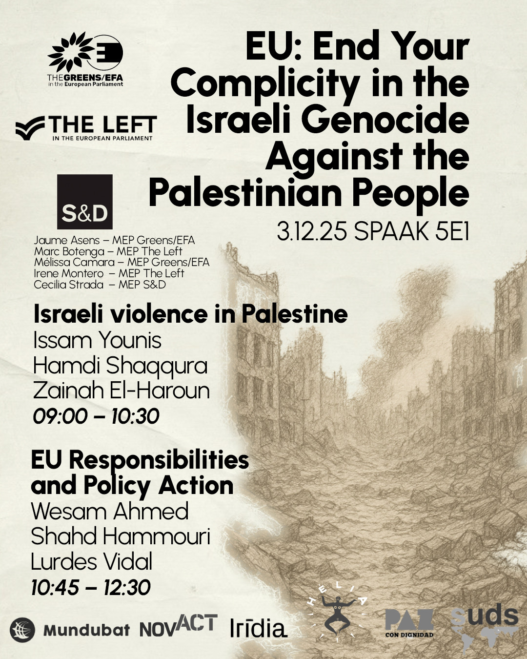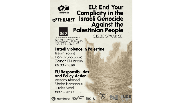The event will bring together experts and representatives of Palestinian civil society to analyse the current situation on the ground and to address the responsibilities of the European Union from a legal, political, and human rights perspective.