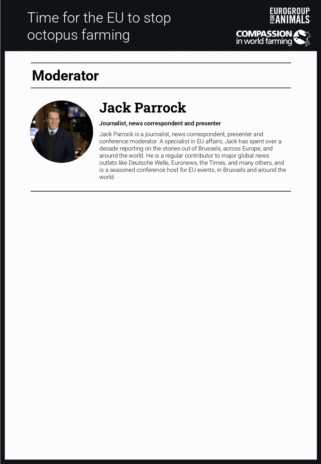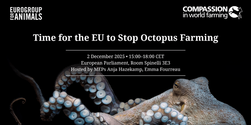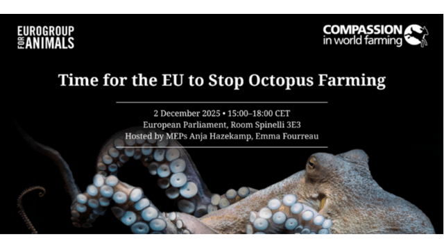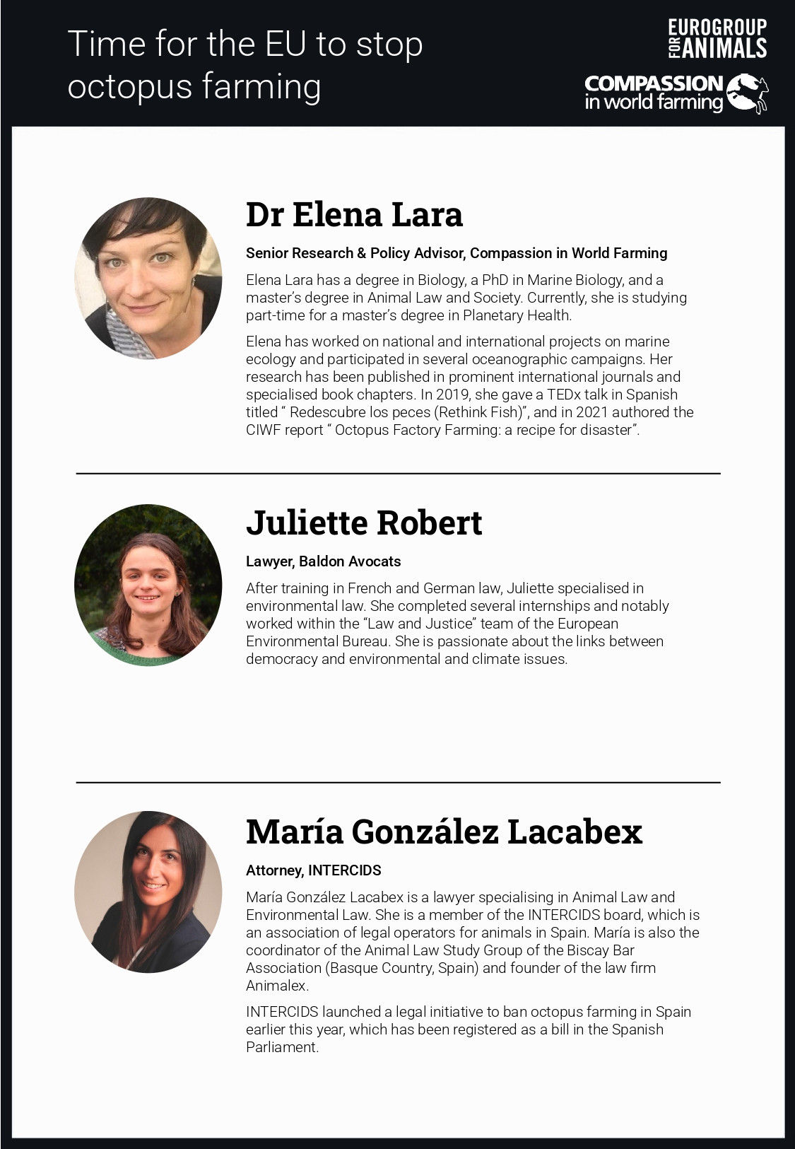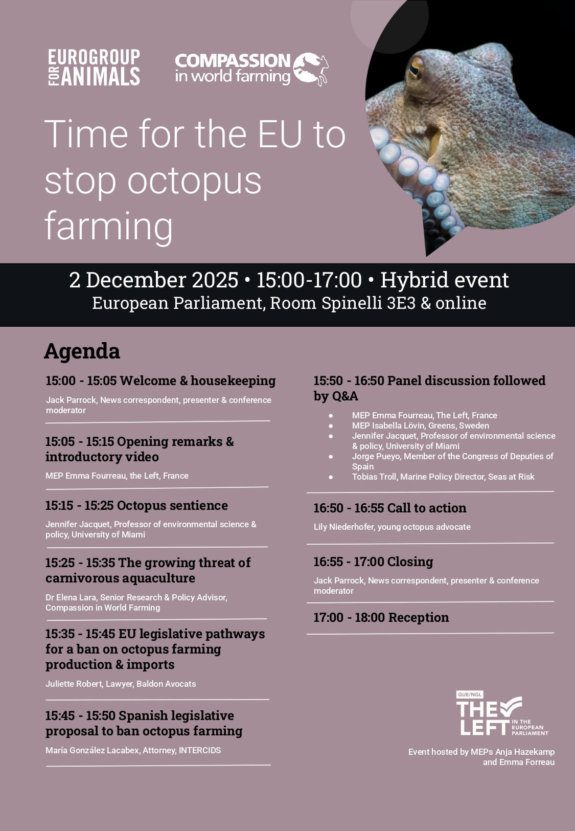 MEP EVENT Time for the EU to Stop Octopus Farming📅 Date:Tuesday, 2 December 2025🕐 Time:15:00 - 18:00 CET📍 Location:European Parliament, BrusselsRoom Spinelli 3E3 & OnlineHosted byAnja HAZEKAMP Netherlands MEP Member of the European ParliamentThe LeftPartij voor de Dieren (NL) Emma FOURREAU France MEP Member of the European ParliamentThe LeftLa France Insoumise (FR) ContextThe event will gather policymakers from the European Parliament, Council and the European Commission, as well as scientific and civil society stakeholders to raise awareness of the animal welfare and environmental risks of octopus farming. It will include a discussion on how policymakers can act to prevent unsustainable aquaculture practices from emerging in the European Union, in line with the 2030 Strategic Guidelines for a more Sustainable and Competitive EU Aquaculture, and the European Ocean Pact objectives.Programme15:00 - 15:05Welcome & housekeepingJack Parrock, News correspondent, presenter & conference moderator15:05 - 15:15Opening remarks & introductory videoMEP Emma Fourreau, The Left, France15:15 - 15:25Octopus sentienceJennifer Jacquet, Professor of environmental science & policy, University of Miami15:25 - 15:35The growing threat of carnivorous aquacultureDr Elena Lara, Senior Research & Policy Advisor, Compassion in World Farming15:35 - 15:45EU legislative pathways for a ban on octopus farming production & importsJuliette Robert, Lawyer, Baldon Avocats15:45 - 15:50Spanish legislative proposal to ban octopus farmingMaría González Lacabex, Attorney, INTERCIDS15:50 - 16:50Panel discussion followed by Q&A• MEP Emma Fourreau, The Left, France• MEP Isabella Lövin, Greens, Sweden• Jennifer Jacquet, Professor of environmental science & policy, University of Miami• Jorge Pueyo, Member of the Congress of Deputies of Spain• Tobias Troll, Marine Policy Director, Seas at Risk16:50 - 16:55Call to actionLily Niederhofer, young octopus advocate16:55 - 17:00ClosingJack Parrock, News correspondent, presenter & conference moderator17:00 - 18:00ReceptionJack PARROCKNews correspondent & presenterConference moderator Jennifer JACQUETProfessor of environmental science & policyUniversity of Miami Dr Elena LARASenior Research & Policy AdvisorCompassion in World Farming Isabella LÖVIN Sweden MEP Member of the European ParliamentGreens/EFAMiljöpartiet de gröna (SE) Lily NIEDERHOFERYoung octopus advocateJuliette ROBERTLawyerBaldon Avocats María GONZÁLEZ LACABEXAttorneyINTERCIDS Jorge PUEYOMember of ParliamentCongress of Deputies of Spain Tobias TROLLMarine Policy DirectorSeas at Risk Important – This event is by invitation, and only registered participants will be admitted. Due to capacity constraints, all attendees must register, including those already holding a European Parliament access badge.